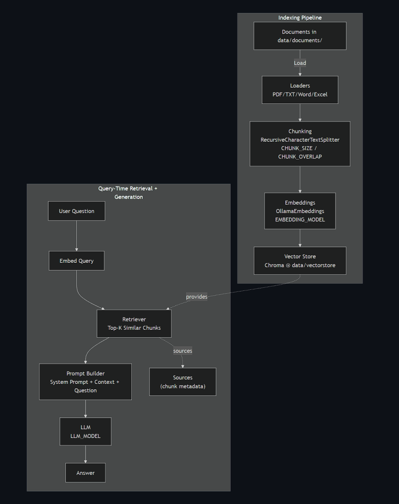 • Returns answer + source metadata (filenames / pages / sheets) + raw context chunks.